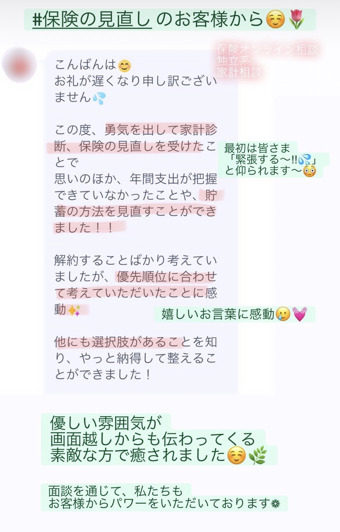 事前に保険の資料をLINEでお送りいただき、面談当日は、下記の流れでお話させていただきます。
